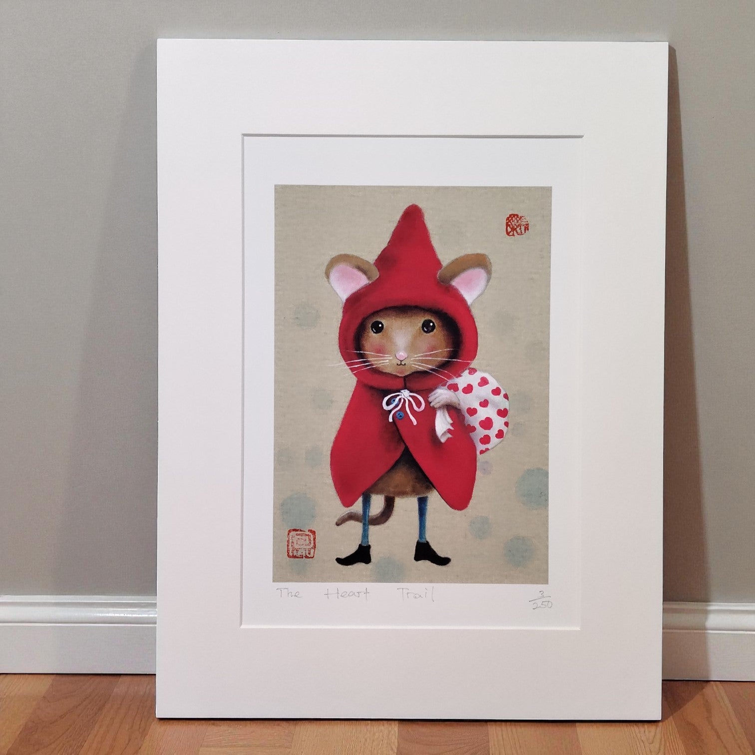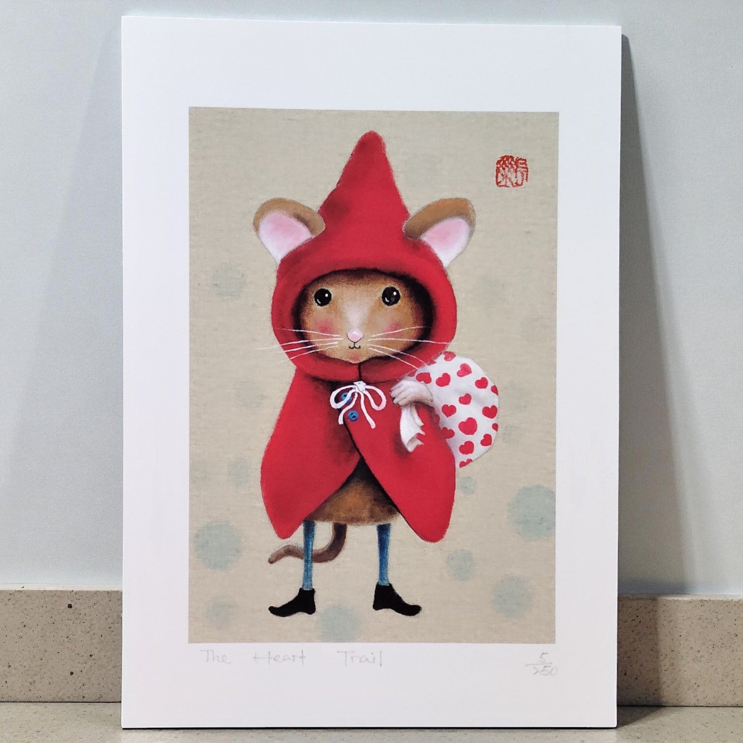 A little mouse sets off on her own adventure, wrapped in a red hood and carrying a heart-spotted bundle.