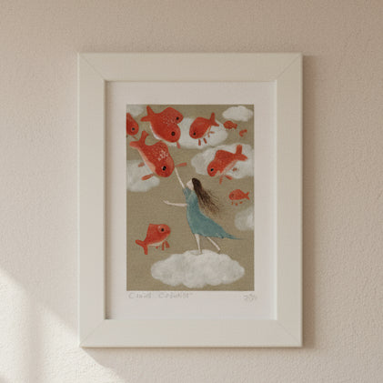 At twilight, when the clouds turn to sea, she stretches her hand to catch a dream. The golden fish glided close, brushing her fingertips with shimmering light. Cloud Catcher reminds us that dreams are always within reach — if only we dare to reach out.